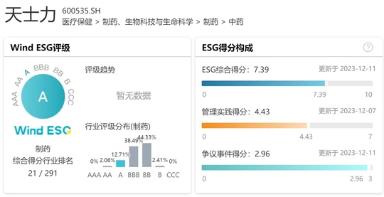 2023 年是我国提出“双碳”目标的第三年,三年来随着“双碳”进程的稳步推进,ESG(环境、社会和治理)成为资本市场热词之一,而ESG的发展成色也成为衡量一家上市公司期末“成绩”的重要指标。在可持续发展呼声日益高涨的今天,天士力在ESG方面的卓越表现备受瞩目。天士力首次在万得(Wind)ESG评级中荣获A级评价,这是天士力在ESG实践方面取得的最新进展,也彰显了其在推动可持续发展和履行社会责任方面的决心。具体来看,在万得(Wind)ESG评级中,截止2023年年底,天士力的综合得分居制药行业的前10%,在医药行业居领先地位。在ESG评分构成中,天士力ESG综合得分为7.39(总分10分),管理实践得分4.43(总分7分),争议事件得分2.96(总分3分),在制药行业的综合得分行业排名为21名(总企业家数291家)。值得一提的是,天士力已连续12年发布社会责任报告,其中涵盖了社会、治理、环境三大板块,与ESG的核心要素一一对应。公司此前也曾在投资者互动平台表示,公司高度重视ESG相关工作,未来公司将继续按照相关工作要求推进ESG工作。这充分展示了天士力将ESG理念深度融入公司的发展战略中。