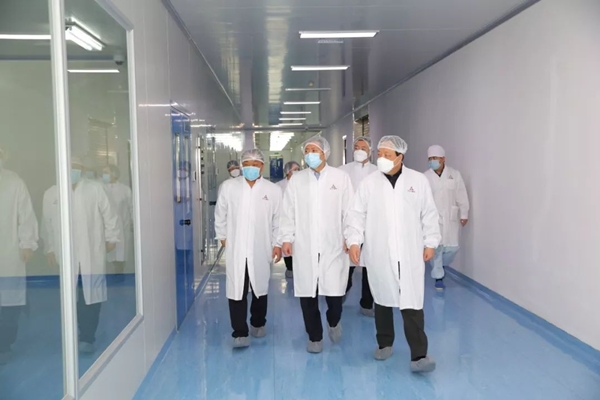 随后,各位领导来到天士力之骄药业中药冻干粉针制剂车间进行考察指导。闫希军主席向王栩冬局长详细介绍了公司益气复脉冻干粉针生产情况。该产品来源于生脉散,是利用数字化、智能化制造技术研制而成的现代药物制剂,与传统注射剂相比,质量标准进行了很大的提升,安全性更高、不良反应更低。王栩冬局长充分肯定天士力的创新精神,要求公司全力保障疫情急需药品生产供应,同时注意做好人员防护,一手抓疫情防控,一手抓经济发展,为此次疫情防控贡献企业的力量。