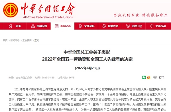 4月28日,为团结激励广大职工喜迎二十大、建功新时代,中华全国总工会召开大会,表彰2022年全国五一劳动奖和全国工人先锋号获得者。天士力医药集团股份有限公司质量检验中心荣获“全国工人先锋号”荣誉称号!