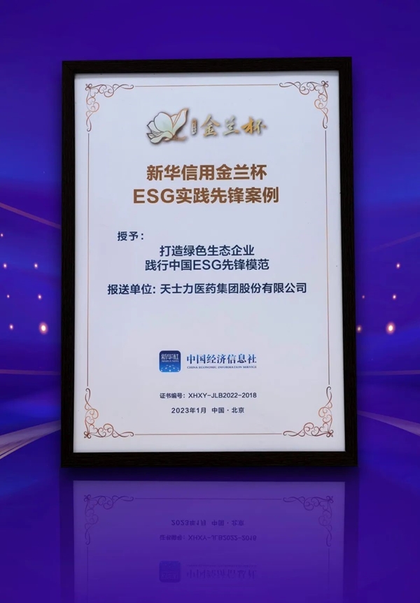 2023年1月5日,由国家发改委指导、新华通讯社等单位主办的第四届中国城市信用建设高峰论坛——碳路中国ESG实践与发展主题论坛在京举行。论坛上发布了“新华信用金兰杯”ESG优秀案例评选结果,天士力医药集团获评“新华信用金兰杯”ESG实践先锋奖。