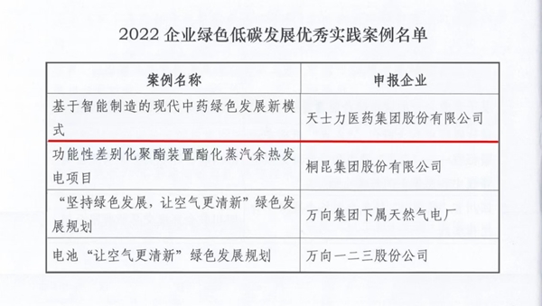 近日,中国企业联合会、中国企业家协会联合发布了“2022企业绿色低碳发展优秀实践案例”名单,天士力医药集团股份有限公司(《基于智能制造的现代中药绿色发展新模式》)作为中药行业的唯一企业入选。