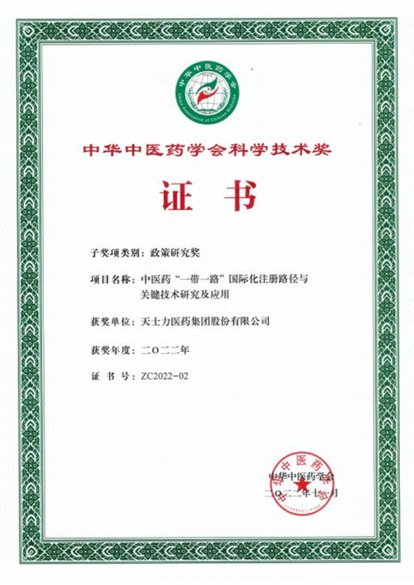 近期,2022年度中华中医药学会科学技术奖评审工作及社会公示已顺利结束。由天士力医药集团股份有限公司自主研究完成的“中医药‘一带一路’国际化注册路径与关键技术研究及应用”项目荣获政策研究奖。