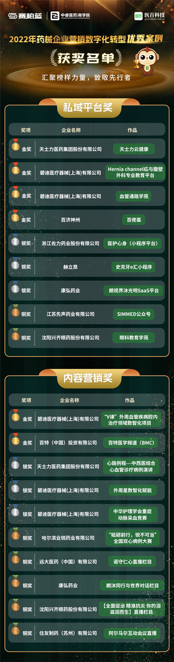 2023年3月14日,由医百战略研究院、赛柏蓝、中睿医药商学院联合主办的“2022药械企业营销数字化转型优秀案例评选”结果盛大揭晓。30个优秀案例榜上有名,成为医药数字化营销行业中的佼佼者。其中,天士力医药集团股份有限公司的“天士力云健康”项目获得私域平台奖金奖,“心路例程——中西医结合心血管诊疗病例演讲”项目获得内容营销奖银奖。