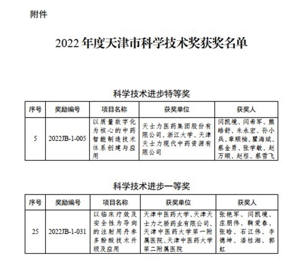 3月20日,天津市人民政府发布了2022年度天津市科学技术奖评选结果。由天士力医药集团牵头完成的“以质量数字化为核心的中药智能制造技术体系创建与应用”喜获市科技进步特等奖,为集团首次获此殊荣。同时,天津天士力之骄药业有限公司参与完成的“以临床疗效及安全性为导向的注射用丹参多酚酸技术升级及应用”荣获市科技进步一等奖。