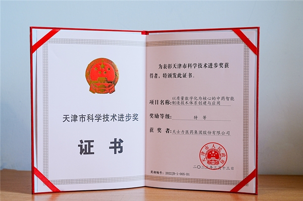 2022年度全市有200项成果获得天津市科学技术奖。其中,自然科学奖18项、技术发明奖8项、科技进步奖174项(含特等奖11项)。市委书记陈敏尔,市委副书记、市长张工等为2022年度天津市科学技术奖特等奖、一等奖获奖代表颁奖。天士力医药集团牵头完成的“以质量数字化为核心的中药智能制造技术体系创建与应用”是唯一一个由中药企业牵头的获奖项目。该成果围绕中药制造全过程多组分的整体性控制、中药全产业链多要素的系统性控制2个质量控制要求,融合中医药理论与数字智能技术,实现了中药质量量化表征指标群设计技术、中药制造工艺系统开发技术、中药全程质量控制技术、高速射流高频振动分散滴丸装备等四大技术创新,为患者提供安全有效、质量可控的现代中药,保障人民生命安全和身体健康。同时,天士力之骄药业有限公司作为第二完成单位参与完成的“以临床疗效及安全性为导向的注射用丹参多酚酸技术升级及应用”获天津市科技进步一等奖。