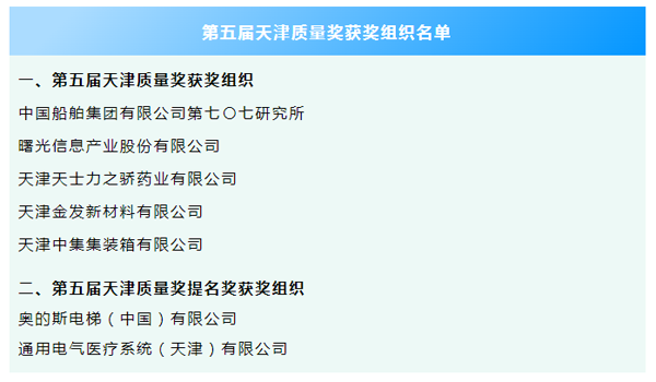 天津质量奖是天津市质量工作领域中的最高奖项,授予质量管理模式先进的组织。天津质量奖旨在推广先进质量管理模式和方法,促进质量管理创新,推行先进质量理念,引导全社会不断提升质量水平,实现质量立市。天津质量奖每两年评选一届,包括“天津质量奖”和“天津质量奖提名奖”,每届“天津质量奖”和“天津质量奖提名奖”获奖组织均不超过 5 个。天津市人民政府对获得“天津质量奖”的组织进行表彰,给予一次性奖励 100 万元。