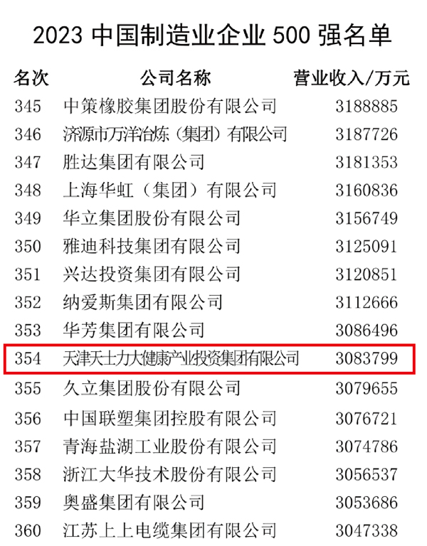 由中国企业联合会、中国企业家协会评选的“2023中国大企业创新100强”、“2023中国制造业企业500强”等榜单于9月20日揭晓。天士力位居中国大企业创新100强第73位、中国制造业企业500强第354位。