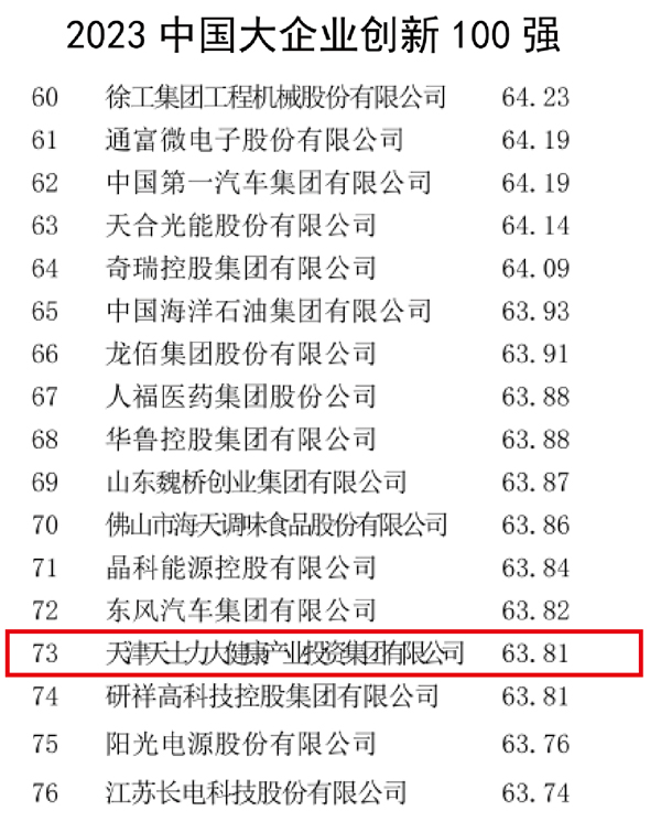 中国企业联合会、中国企业家协会连续第3年推出“中国大企业创新100强”。2023中国大企业创新100强依据2022年企业研发投入强度、研发费用、发明专利数、非发明专利数、收入利润率等指标进行综合评价筛选评出,华为投资控股、中兴通讯股份、中国航天科工等企业排名前茅,天士力连续三年入选榜单,2023年排名较上年再次提升。
