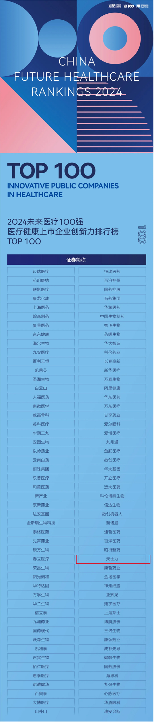 未来医疗100强评选于2024年5月9日在北京举办的2024VBEF未来医疗生态展会颁奖晚宴及动脉网官微公开发布。天士力连续入围“医疗健康上市企业创新排行榜TOP100“。