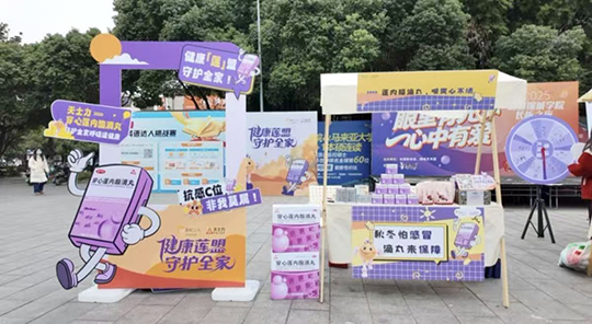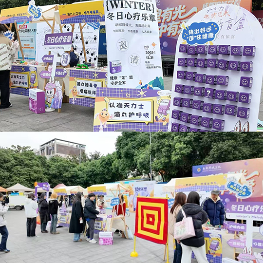 活动现场精心设置了主题展区与创意摊位,通过“转出好运‘莲’住健康”盲盒墙、幸运大转盘等趣味互动装置,吸引了大批师生参与。展区内,“咽喉降燥火,清音润心扉”“感冒小克星,滴丸显神通”等主题标语与音乐元素创意插画相得益彰,直观传递了穿心莲内酯滴丸的产品特性。打卡互动区的设置,让师生在拍照留念的同时,潜移默化地理解了“健康莲盟,守护全家”的品牌理念。