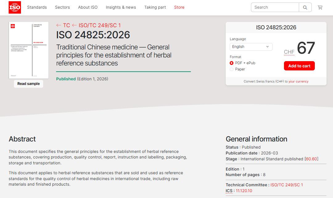2026年3月,由天士力医药集团主导制定的ISO国际标准《ISO 24825:2026中医药—中草药标准物质建立通则》(Traditional Chinese medicine - General principles for the establishment of herbal reference substances)完成全部制定程序,正式面向全球发布。作为全球首个中药标准物质的ISO标准,其出台有效填补了该领域的空白,更是我国在全球中医药质量控制体系实现规则引领迈出的重要一步。
